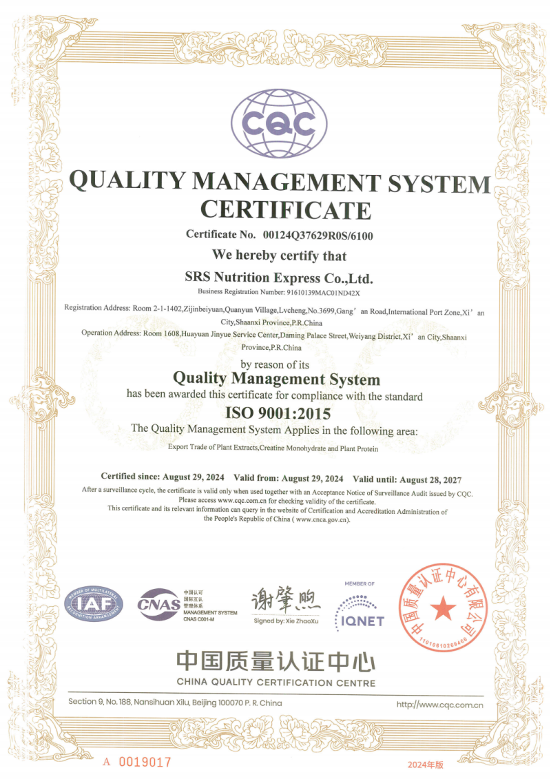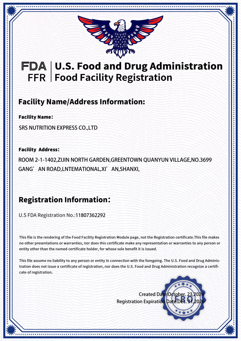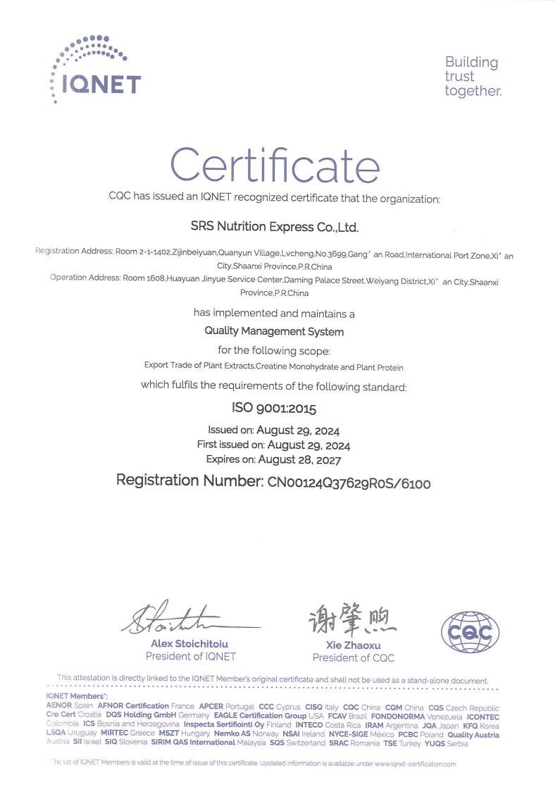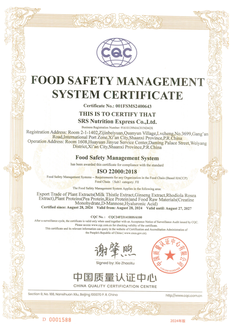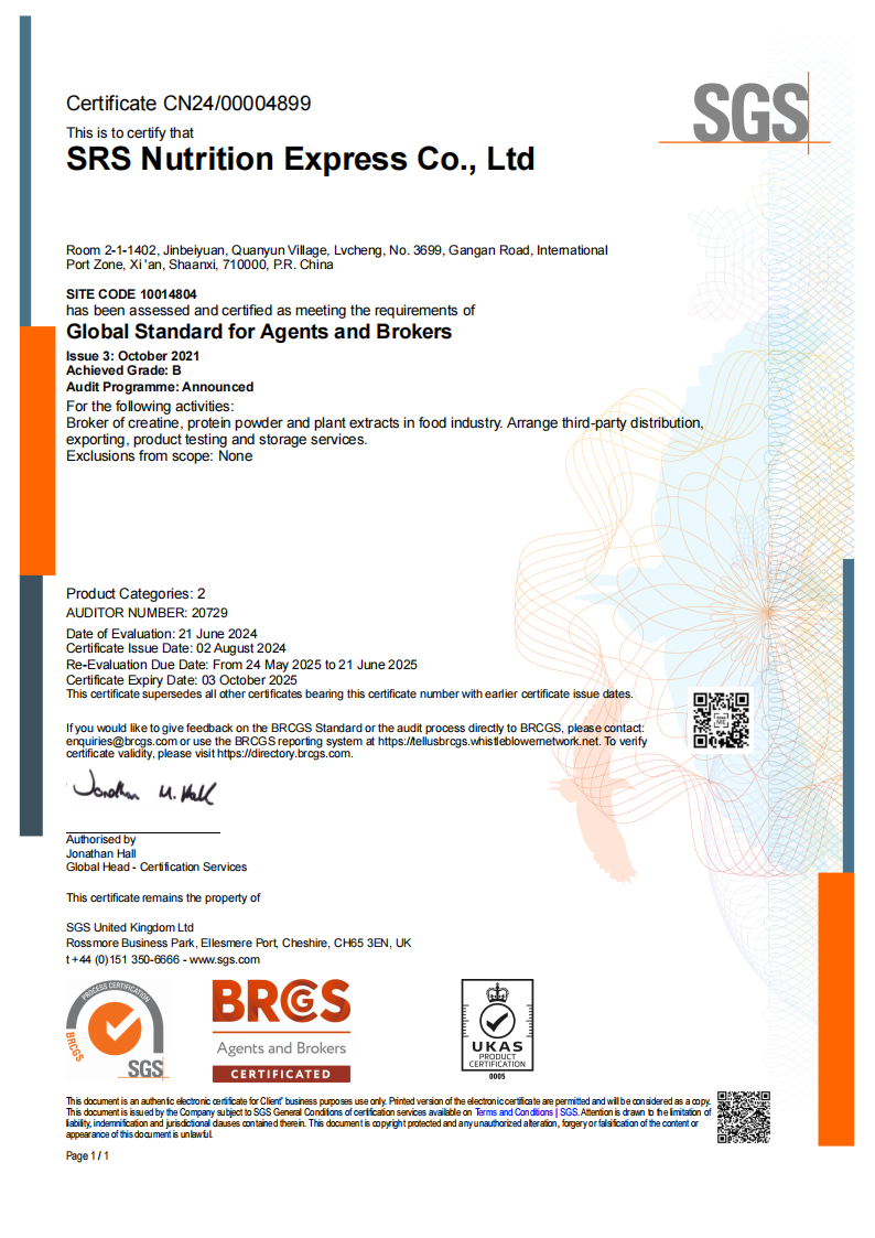 Bei SRS Nutrition Express glauben wir, dass Qualität auf einer Grundlage von Präzision, Vertrauen und fortlaufenden Engagement basiert. Unsere Zertifizierungen, einschließlich ISO9001, ISO22000 und BRC, sind ein Beweis für unser Engagement für die Aufrechterhaltung der höchsten Standards bei jedem Schritt. Wir sind stolz darauf, dass jeder Aspekt unserer Geschäftstätigkeit den strengen Anforderungen der Branche entspricht: