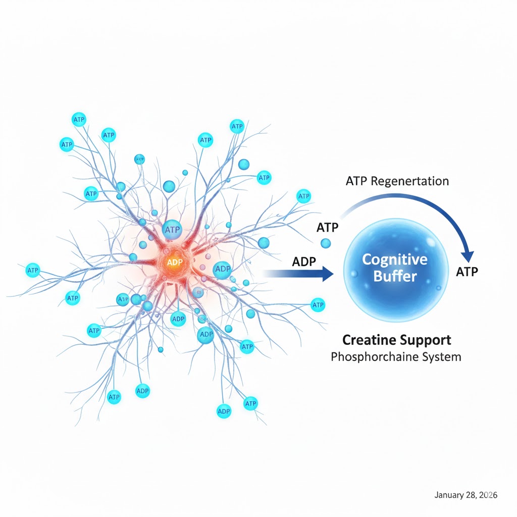 This is where the interest in creatine for sleep deprivation begins. Traditionally known as a bodybuilding staple, creatine monohydrate’s primary job is to provide a “quick-release” phosphate group to turn used-up ADP back into high-energy ATP. In the brain, this process happens via the Phosphocreatine (PCr) system, acting as a metabolic buffer that prevents neural “brownouts” during periods of high stress or low rest.